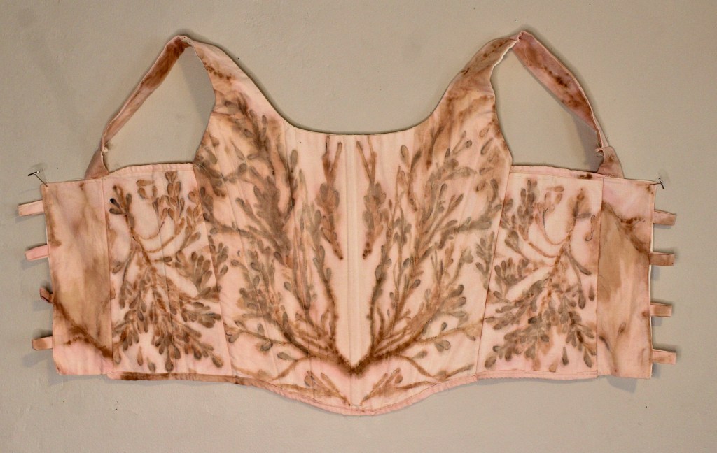 Seaweed ecoprinted cotton corset over dyed with a madder exhaust bath, painted with iron, sewn bamboo boning, holding the memory of the sea within its fibers.