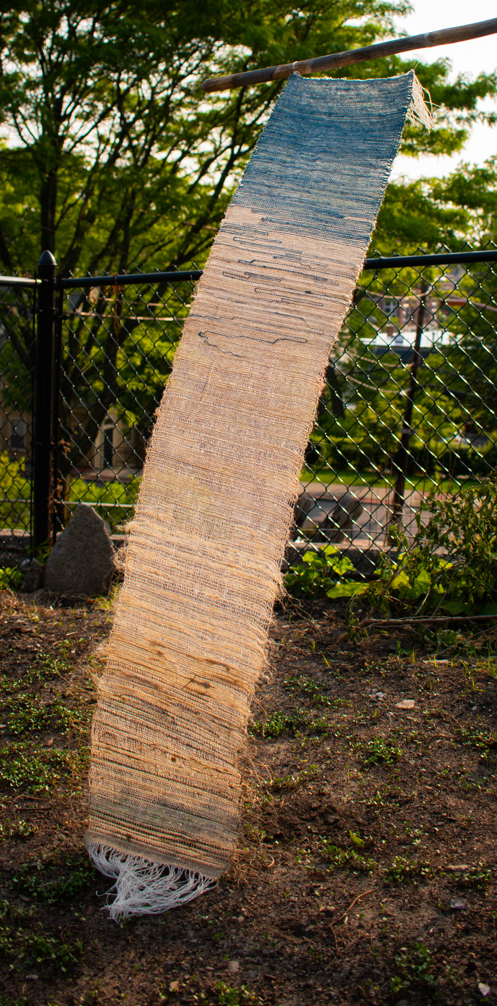 Flax grown locally and on campus, hand processed, spun and dyed into linen yarn, indigo dye. Photographed in a budding flax plot.